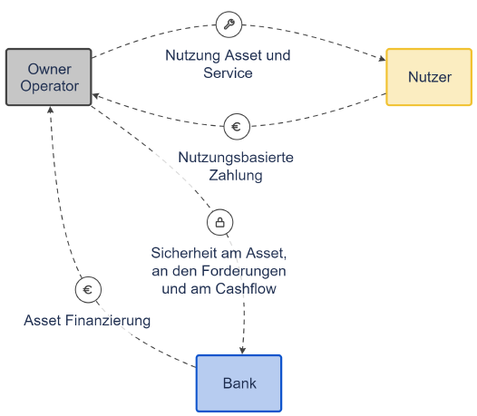Als Sicherheiten für eine Finanzierung des Owner Operators kommen eine Sicherungsübereignung der Anlagen (A), eine Abtretung der Forderungen des Owner Operators gegen die Nutzer sowie ggf. im Hinblick auf Versicherungsansprüche (B) sowie eine Kontoverpfändung über das Konto auf dem die Zahlungen der Nutzer eingehen (C) in Betracht.