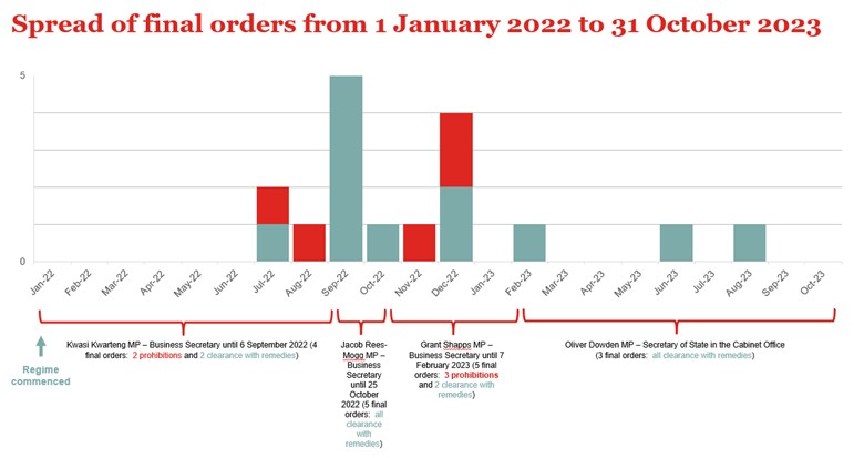 Noticeably fewer deals have been remedied or prohibited in 2023 compared to 2022. 14 transactions received a final order in 2022 either to prohibit the transaction (five transactions) or grant clearance subject to remedies (nine transactions). In 2023, there have been only three final orders so far – all clearance with remedies. The 14 final orders in 2022 were all imposed in the second half of the year (11 during the final four months – coinciding with several changes of Business Secretary). A lack of final orders during the early months of 2022 made sense as the NSI regime bedded-in, and noting a final order can only be imposed once a transaction has been the subject of a full assessment (i.e. an in-depth review). But a low number of final orders in 2023 was less expected, especially after the uptick towards the end of 2022.