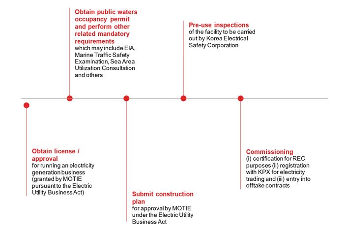 Permitting Whilst this is not unusual in the region, developers in South Korea are subject to a complex permitting process, which requires coordination across several government authorities. Examples include separate approval procedures administered by a variety of central government ministries including the Ministry of Trade Industry and Energy (MOTIE), Korea Electric Power Corp. (KEPCO), Ministry of Environment (MOE), Ministry of Oceans and Fisheries (MOF) and Ministry of Defense (MOD), as well as local government, in order to obtain critical approvals ranging from the electricity business license, grid interconnection agreement, environmental impact assessment, maritime traffic safety assessment, and defense facilities impact operability review & radar impact assessment (RIA). These complexities are exacerbated by the fact the impetus for initiating many of these approval processes is imposed on the developer, and to date the South Korean government has taken a hands-off approach to facilitating stakeholder consents (see below). Legislation remains under consideration to simplify the licencing procedures. |
